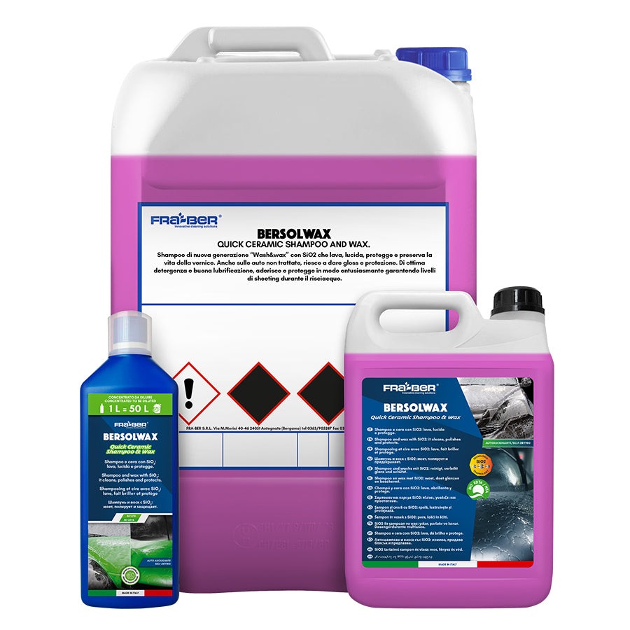 Fra-Ber Bersolwax is een nieuwe generatie “wash & wax” shampoo met SiO₂-technologie die de lak in één stap reinigt, polijst en beschermt. Dankzij zijn geavanceerde formule biedt Bersolwax een diepe glans en langdurige bescherming, zelfs op onbehandelde oppervlakken.